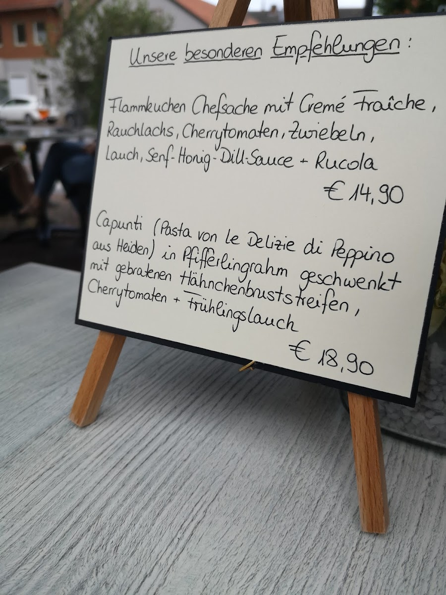 Weinbar Küsschen in Borken offers a delightful array of dishes that showcase both traditional and contemporary flavors. Their menu is designed to satisfy a range of tastes, from light bites to hearty meals. A standout appetizer is the refreshing Sangria, perfect for setting the tone of the meal. For those seeking a classic Italian starter, the Bruschetta is a simple yet flavorful choice, offering a perfect balance of crispy bread and fresh toppings. For meat lovers, the Carpaccio Vom Argentinischen Premium Rind provides a tender, melt-in-your-mouth experience that exemplifies quality beef. The mains are equally impressive, with options such as the Rumpsteak Mit Kartoffelgratin Und Gemüse, a well-cooked steak complemented by rich potato gratin and vegetables. Another flavorful option is the Capunti Mit Hähnchenbruststreifen In Pfifferlingrahm, where tender chicken breast strips are paired with a creamy chanterelle sauce over pasta. For a vegetarian touch, the Käsespätzle An Salat offers a comforting dish of cheese spätzle served alongside a fresh salad. Those craving something lighter may enjoy the Salatteller Mit Hähnchenbrust Streifen, a hearty salad topped with grilled chicken breast strips. The Flammkuchen Küsschen brings a unique twist on a classic with its deliciously crispy base and flavorful toppings. Overall, the menu at Weinbar Küsschen is an inviting mix of flavors, making it a great choice for a satisfying meal in a cozy setting.